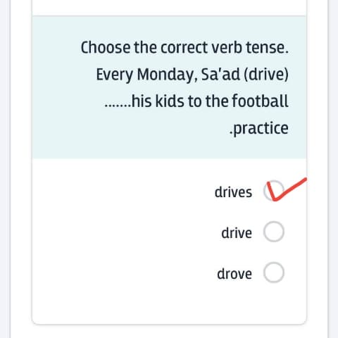 Choose the correct verb tense. Every Monday, Sa'ad (drive) .......his kids to the football practice.